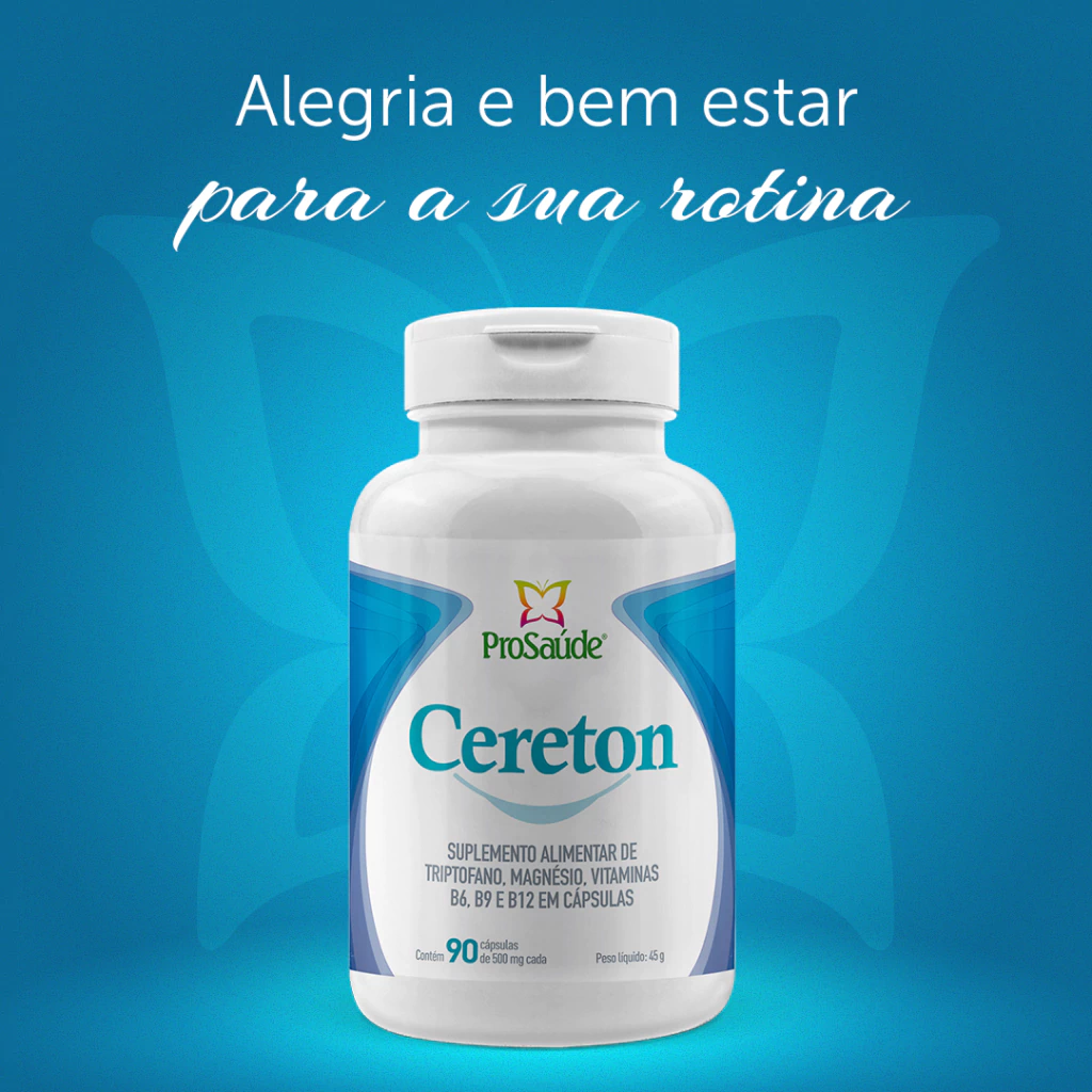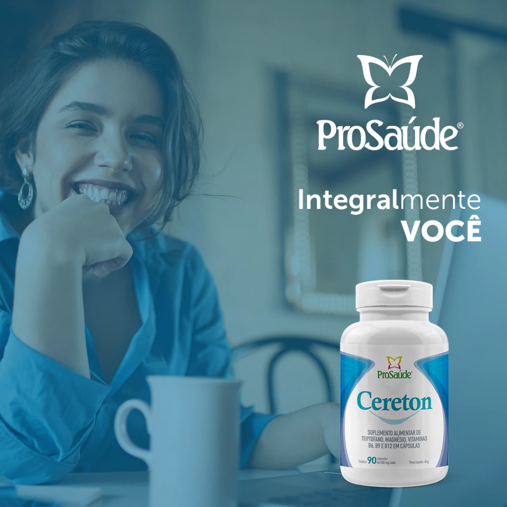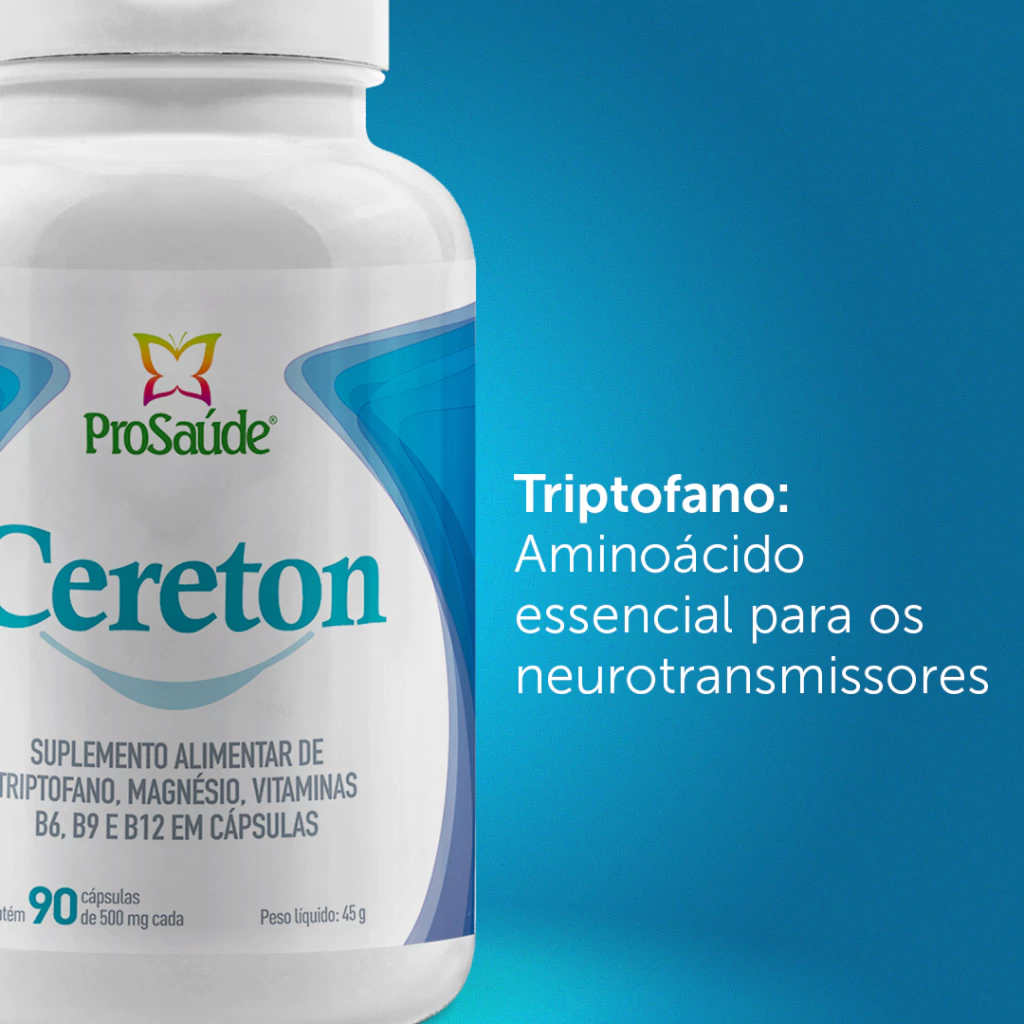 O Cereton ProSaúde é um suplemento alimentar formulado com triptofano, vitaminas B6, B9 e B12 e magnésio, pensado para melhorar o bem-estar físico e mental.