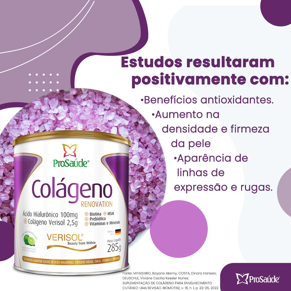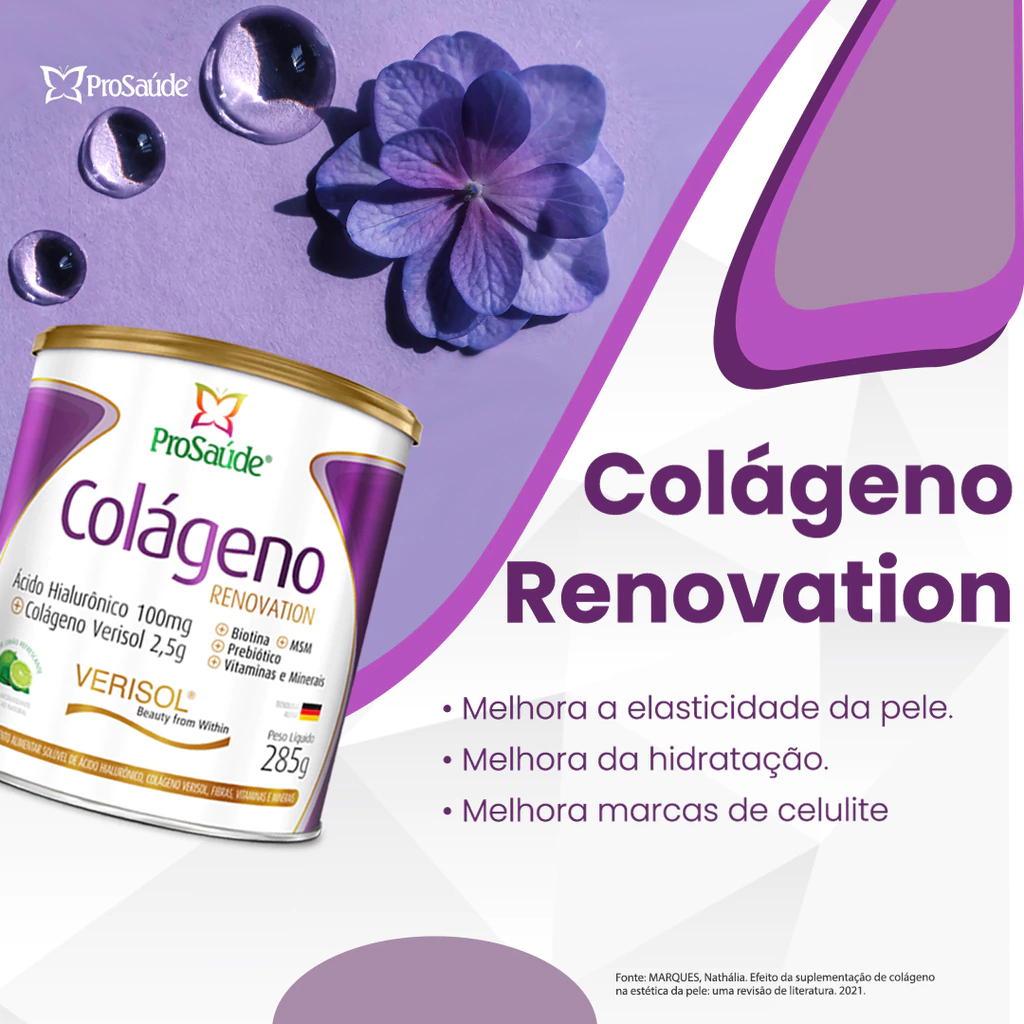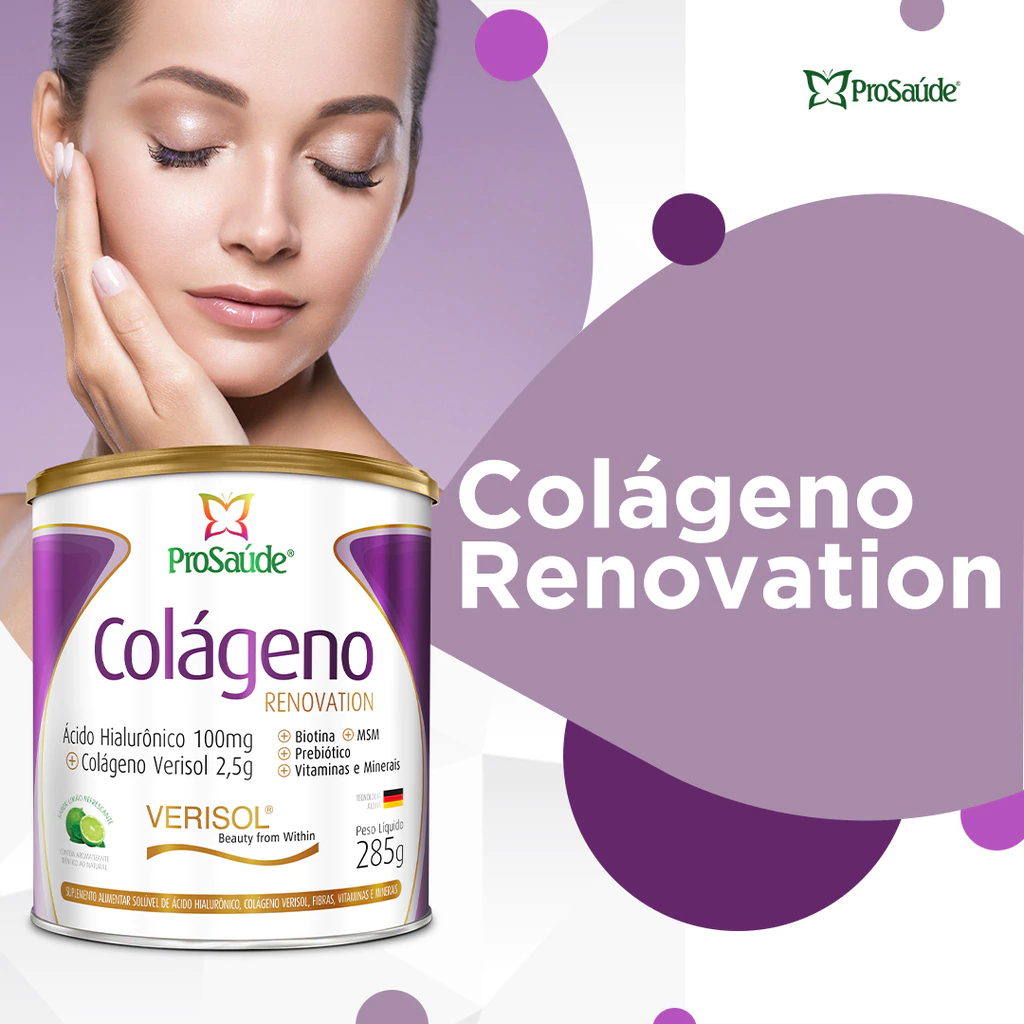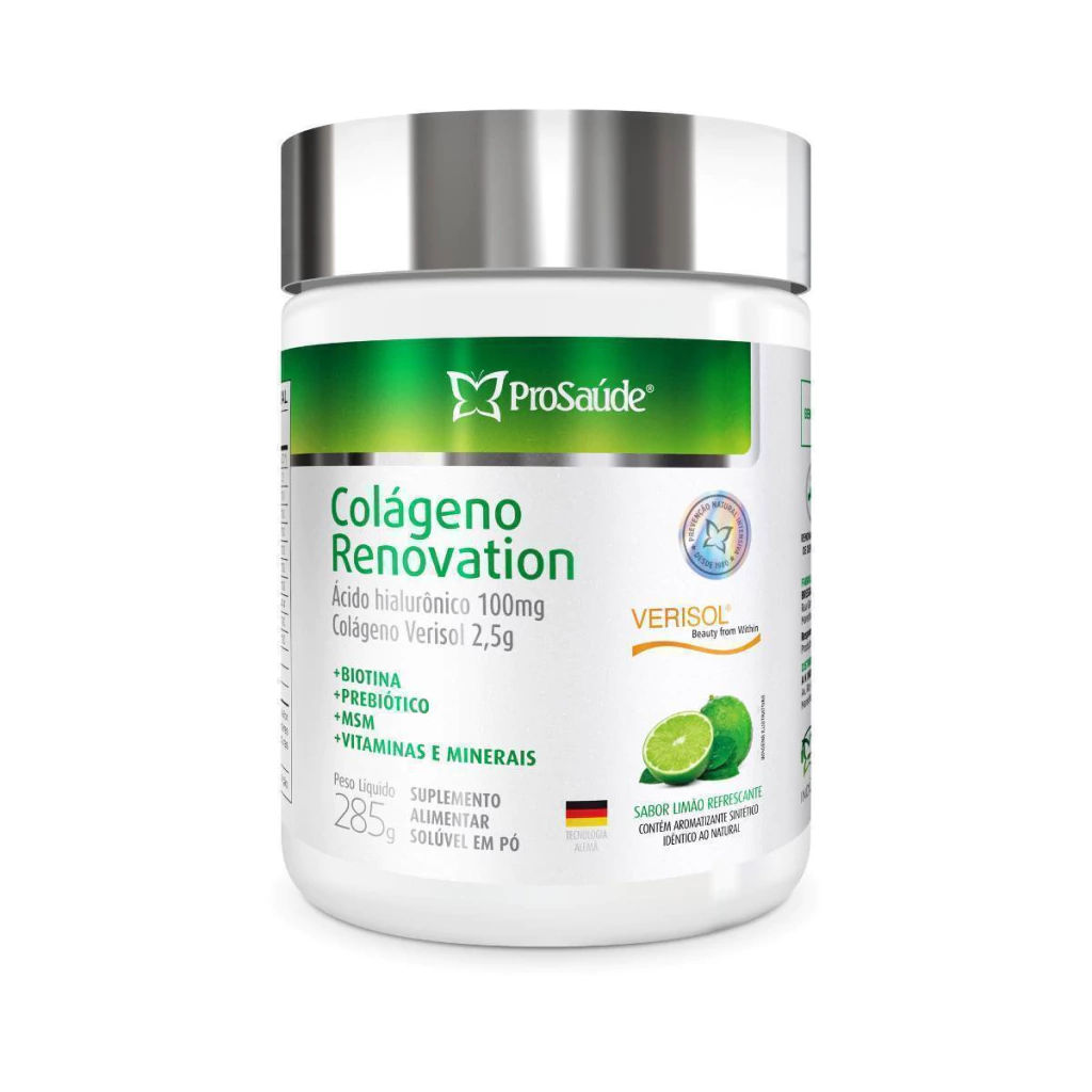 O Colágeno Renovation Limão 285g ProSaúde é um suplemento alimentar completo, formulado com colágeno Verisol, ácido hialurônico, biotina, MSM, fibras prebióticas, vitaminas e minerais.