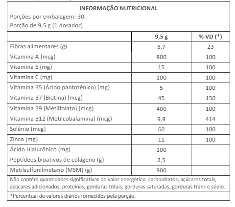 É um suplemento alimentar à base de colágeno Verisol®, ácido hialurônico, fibras prebióticas, vitaminas e minerais que auxiliam na saúde da pele, cabelos e articulações.