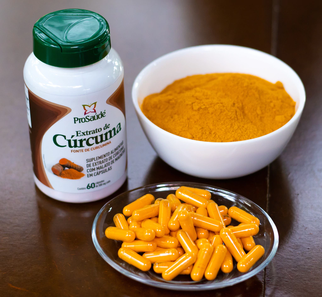 O extrato padronizado em cápsulas concentra maior quantidade de curcumina, oferecendo praticidade, dosagem precisa e maior absorção em relação ao pó culinário.