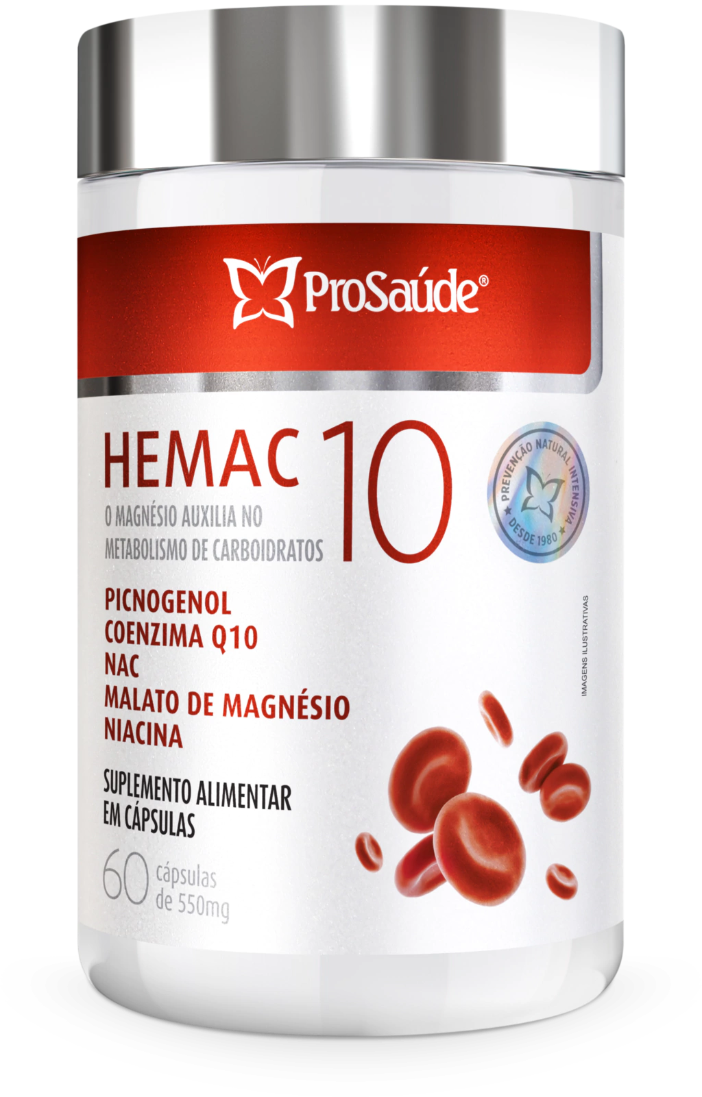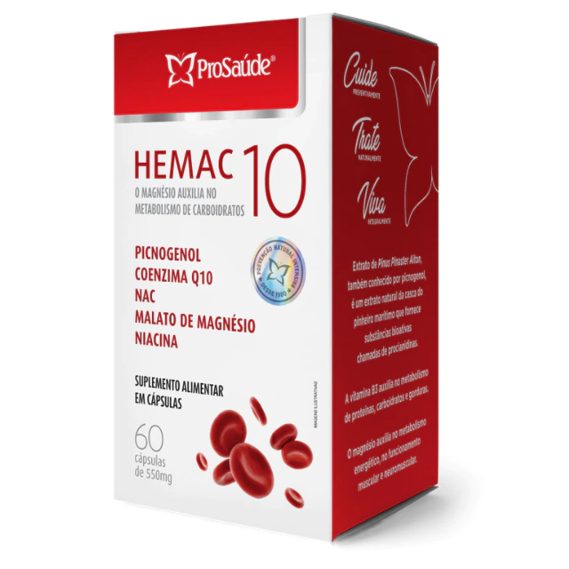 O Hemac10 550mg da ProSaúde é um suplemento alimentar avançado formulado com Extrato de Pinus Pinaster Aiton (Picnogenol), Coenzima Q10, N-Acetil L-Cisteína, Vitamina B3 e Malato de Magnésio.