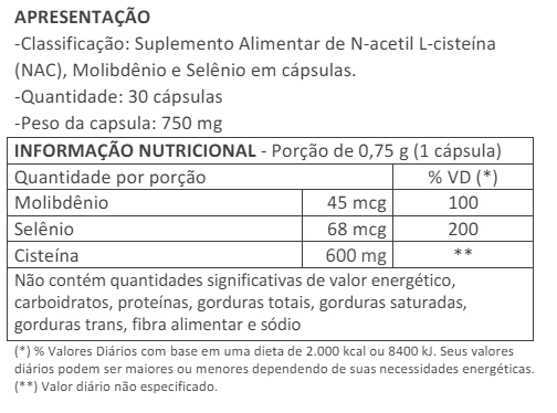 Classificação: Suplemento alimentar de N-acetil L-cisteína (NAC), molibdênio e selênio em cápsulas.